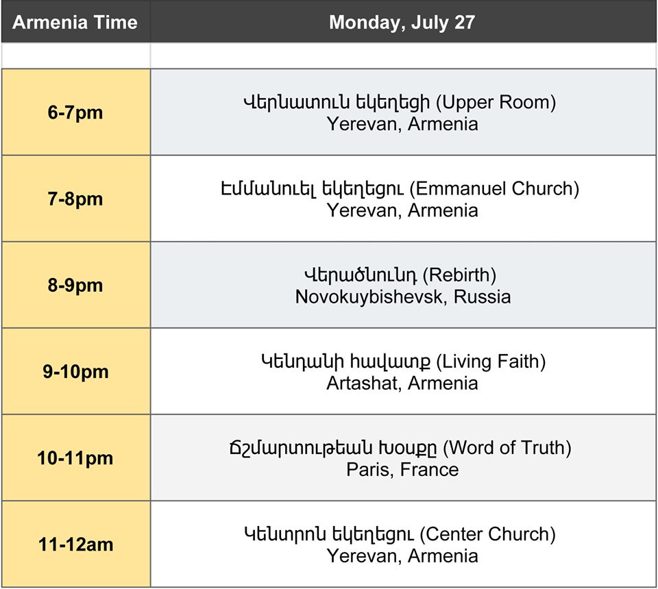 Ինչպես նախապես տեղեկացրել էինք, հուլիսի 27-ից կմեկնարկի Համահայկական աղոթք - 2020 ծառայությունը՝ ՀՀ-ից և արտերկրից տարբեր եկեղեցիների առաջնորդությամբ: